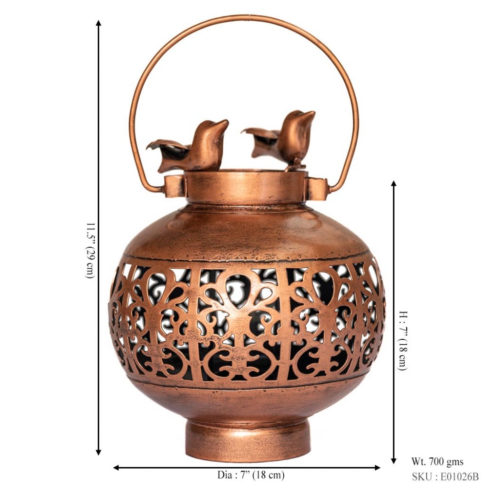 Illuminate your living space with this Copper Handi-Shaped Metal Tea-Light Holder, designed with exquisite detailing and a rustic antique charm. The intricate floral cutwork allows soft candlelight to filter through, creating a mesmerizing pattern on walls. The twin bird design on the top adds a touch of nature and artistic beauty, making it a standout piece for your Diwali decorations or as a thoughtful gift.